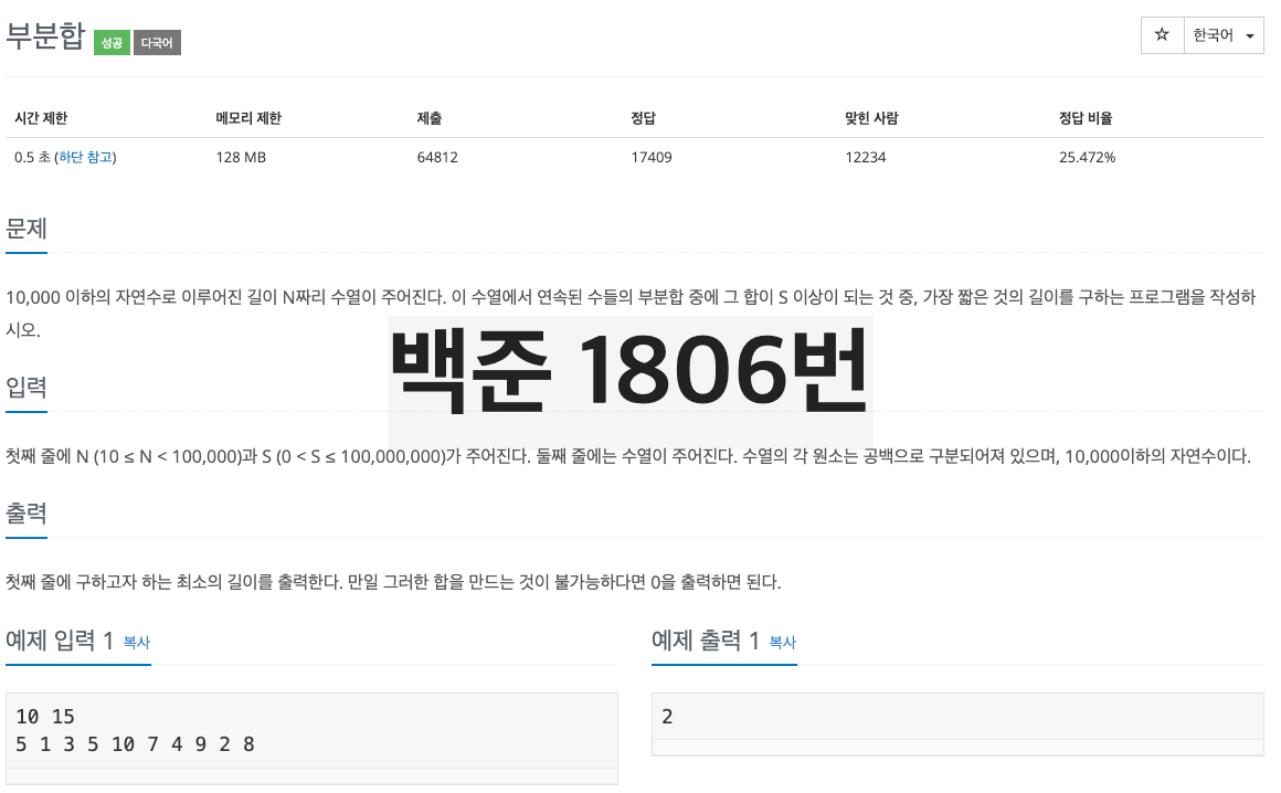 // sum 이 s보다 작으면 rt값 증가 시키고, sum이 s보다 크면 lt를 증가시킴