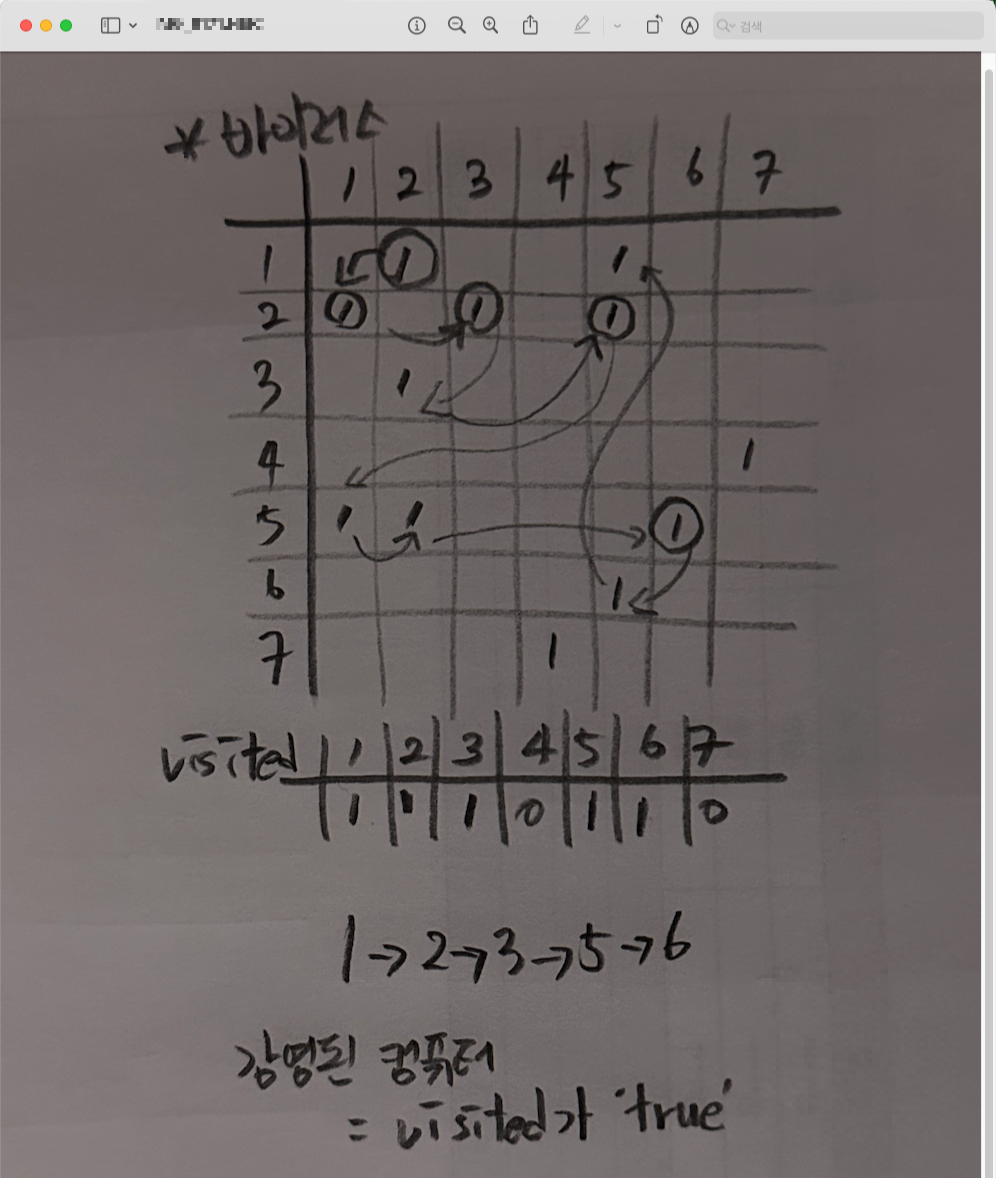 boolean[] visited ๊ฐ์ด true ์ธ ๊ฒฐ๊ณผ์ ๊ฐ์๋ฅผ ์ธ์ด์ฃผ์ด ํ์ด๋ ์๊ด์ ์์ต๋๋ค.