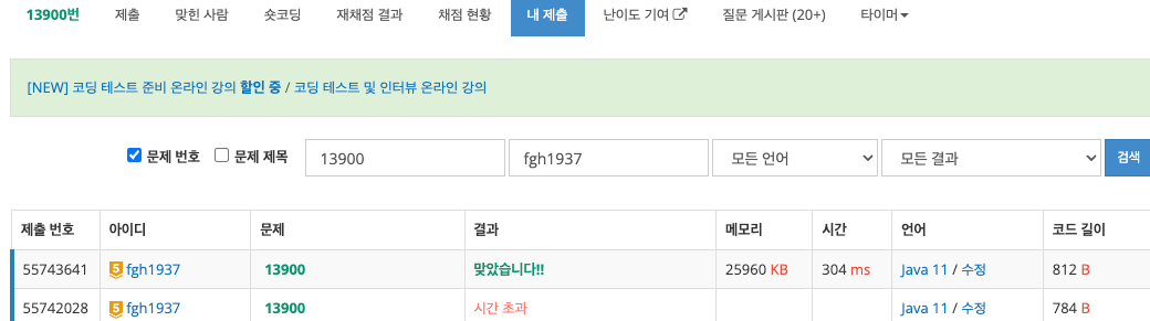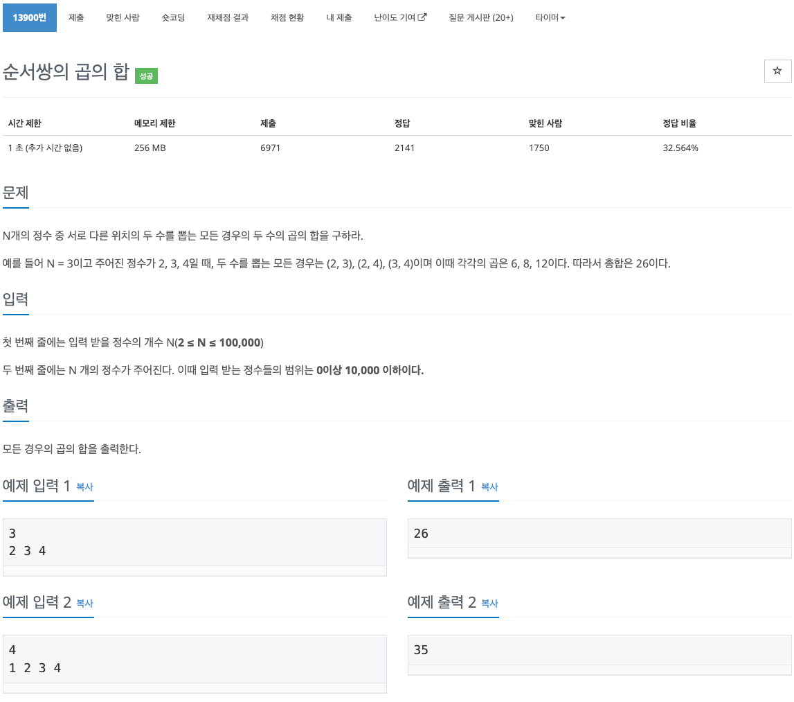 ์ค๋ ํ์ด๋ณผ ๋ฌธ์ ๋ ๋ฐฑ์ค 13900๋ฒ ์์์์ ๊ณฑ์ํฉ ์ ๋๋ค!