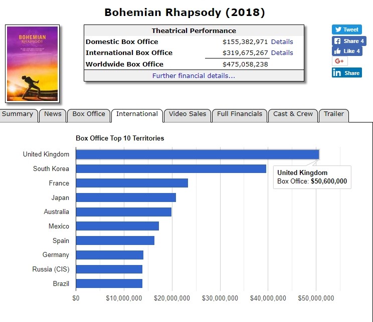역시 'QUEEN' 의 나라답게 영화 흥행 순위 1위는 영국이고,