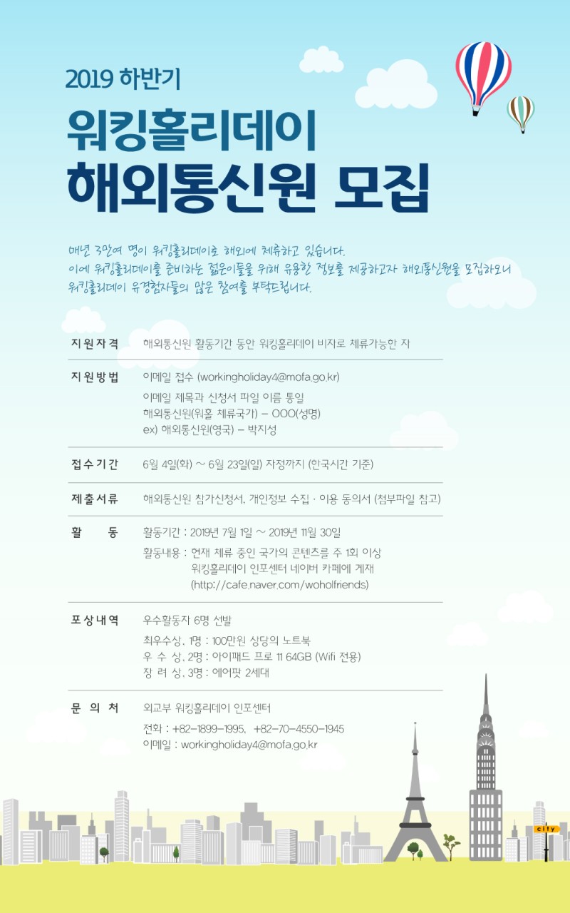 외교부 워킹홀리데이 인포센터|공지사항|2019 하반기 워킹홀리데이 해외통신원 모집